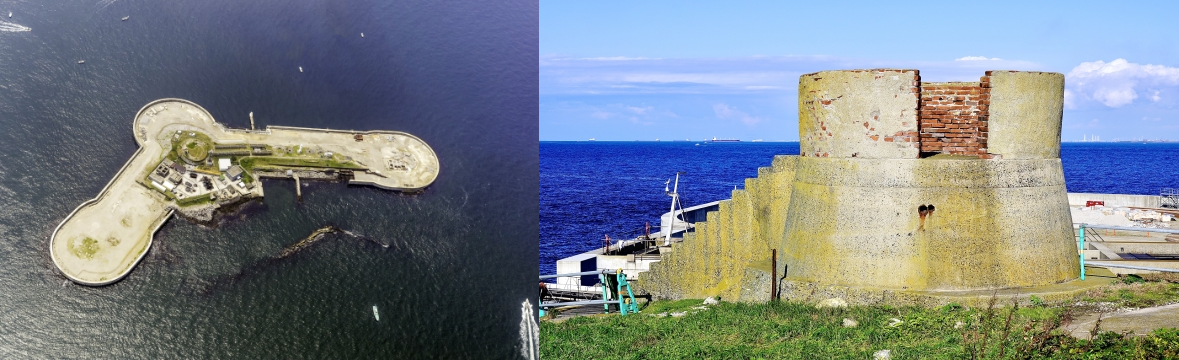 写真(フリー素材)は、上空から見た第二海堡と砲塔観測台です。他にも、掩蔽壕などの歴史的軍事遺構がいくつも残っています。