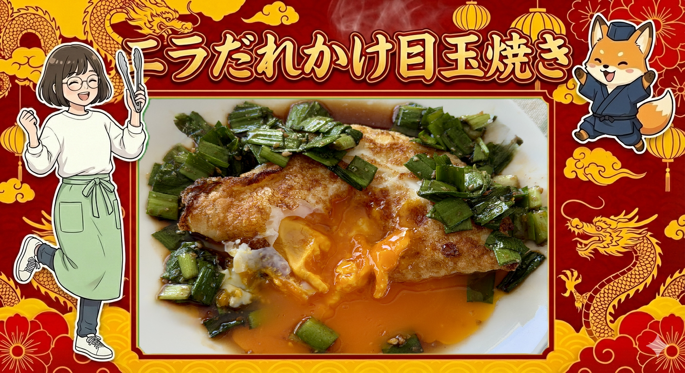 そして写真の方は、「2つ折りのきんちゃく卵風目玉焼き」に、ニラだれをかけて中華のおかず風に仕上げてみてみました。