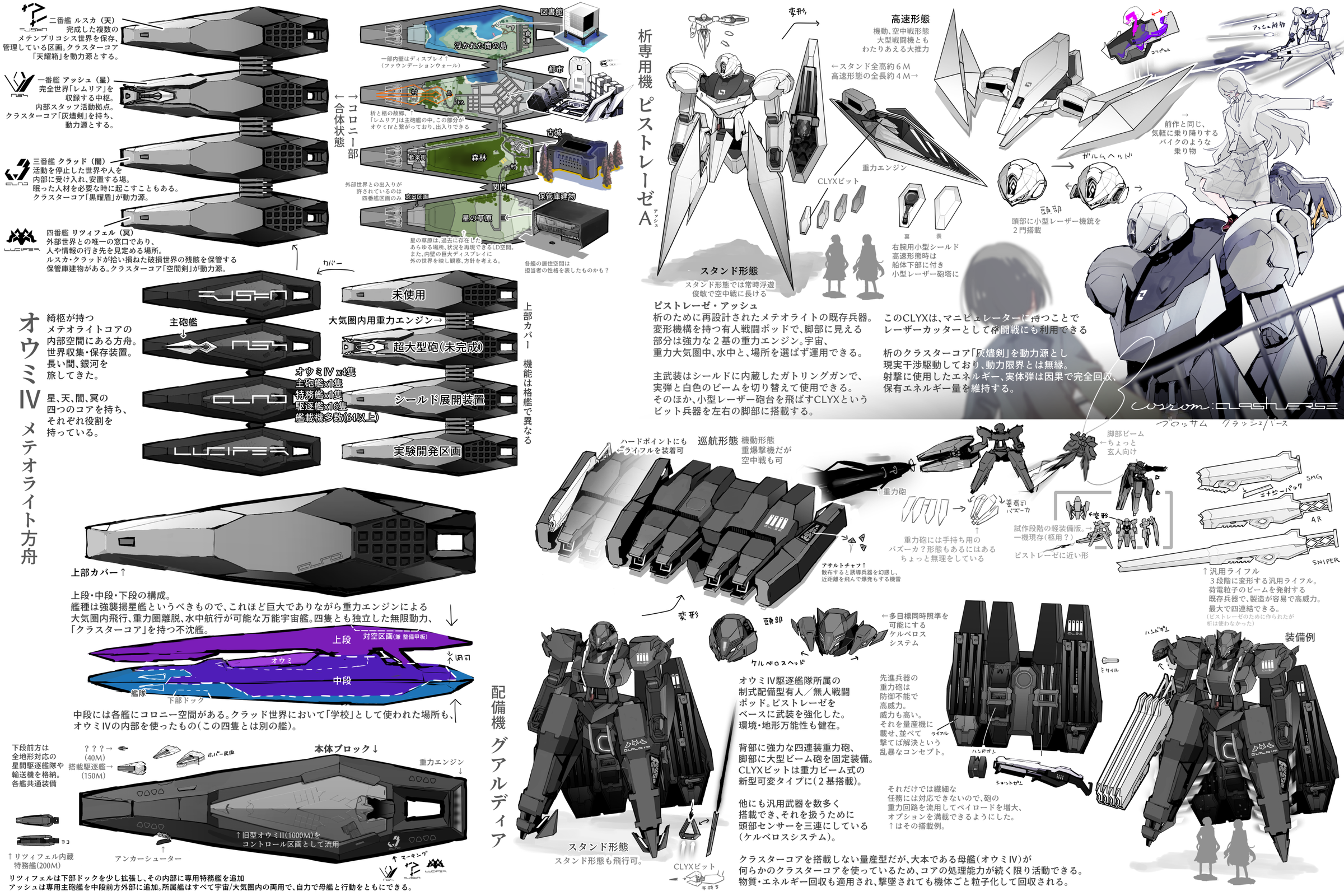今回の絵は、若干趣味に走りすぎたメテオ世界観紹介イラストです。二章三話「イクリプス・レムリア」に登場したメカも含まれています。