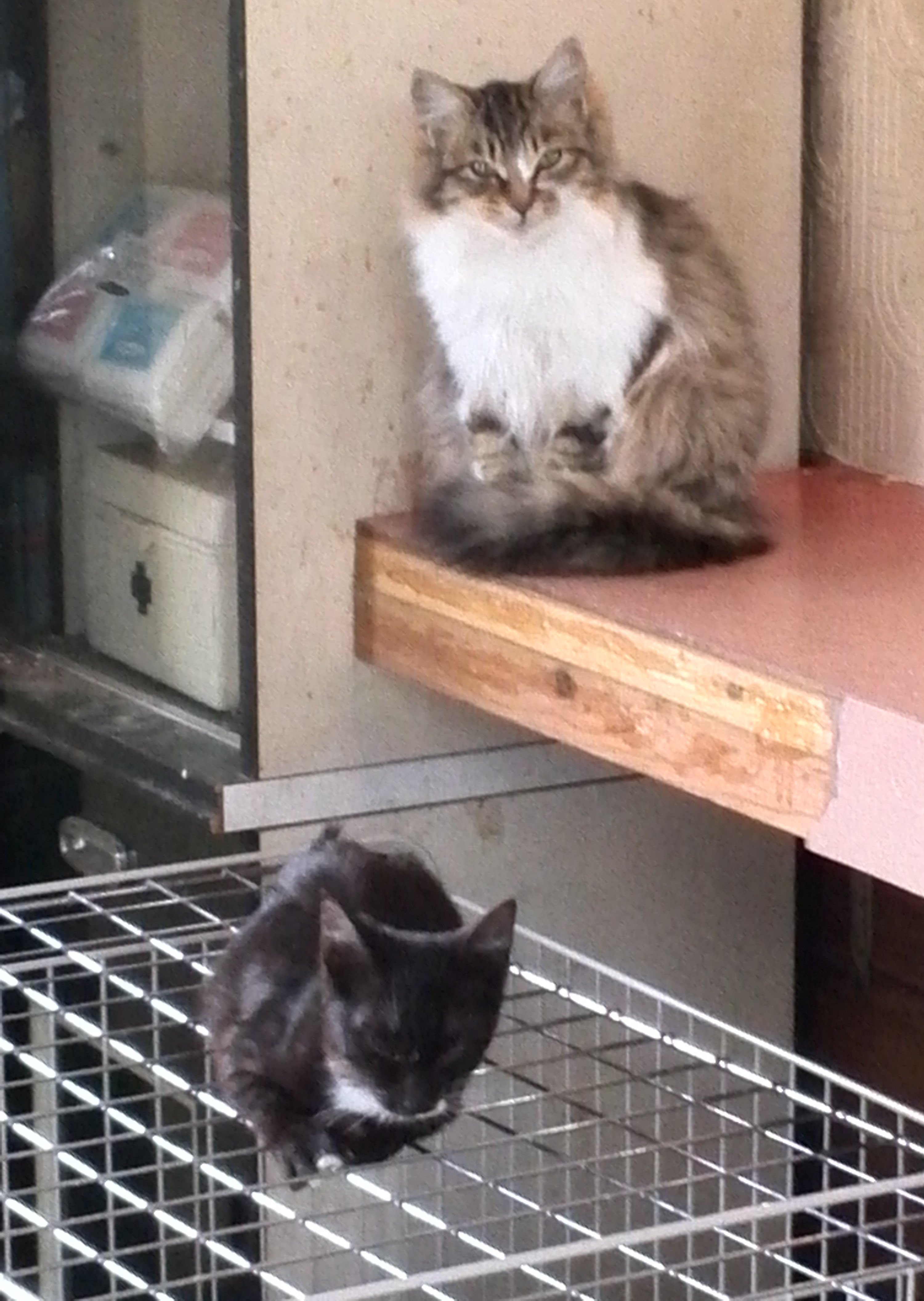 手前の黒猫は、ストーブの囲いの上に乗って暖まってます。