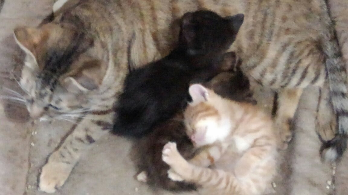 母猫のトラコと、3匹の子猫です。わかりにくいですが、茶トラの下になっているのが黒ブチで、その隣が黒です。撮り方が下手くそでごめんなさい。