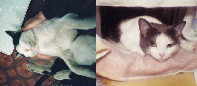 下の画像は、前にも紹介した初代家猫のニャン(左)と二代目家猫のボケ(右)です。今回のニャンは「甘えん坊」バージョンで、亡き母に抱かれているときに撮られた写真のようです。