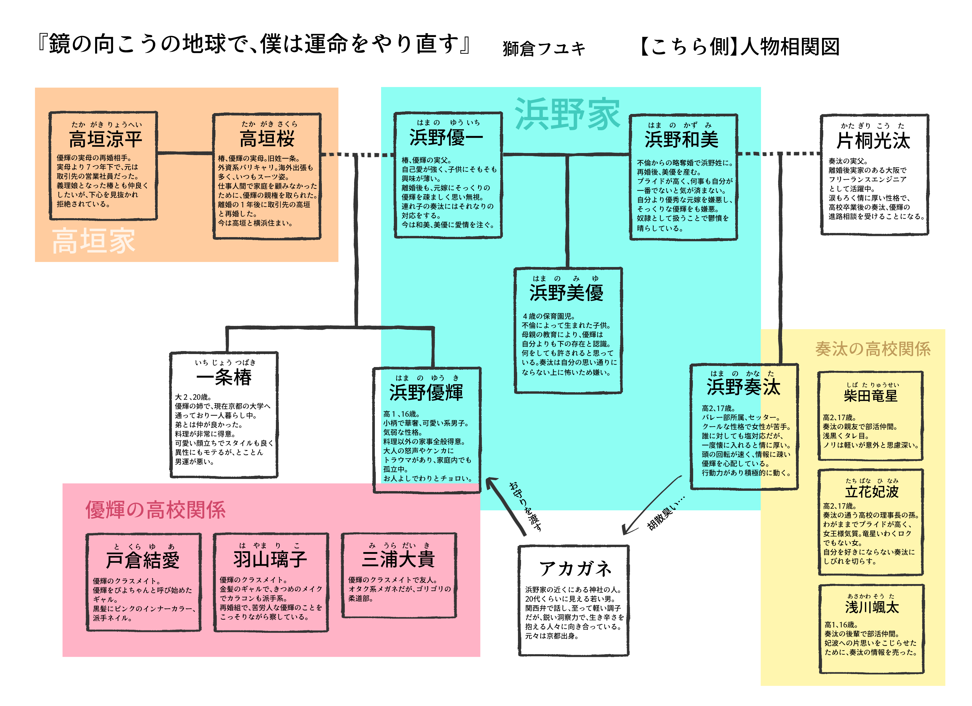 5話あたりまでが【こちら側】のストーリーとなりますが、その中で登場するキャラクターたちの相関図を作ってみました。