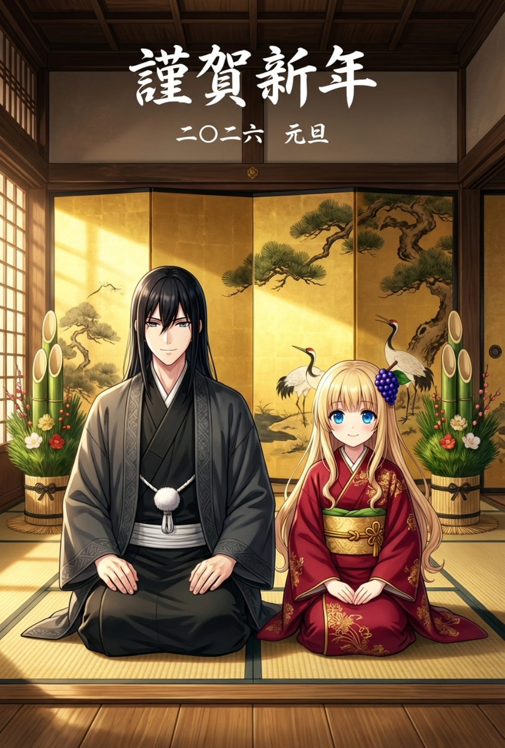※不動さん様に「忍者は三色の姫と踊る」の主人公サカキとイリアティナ姫のイメージ画像をいただいてまして、それを郵政省の年賀状生成で試してみたら見事な年賀状になったので発表します。(ご本人に許可いただいております)