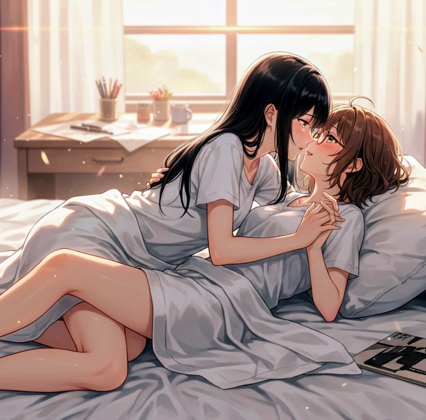 今回は11話の後半シーンをイメージしたイラストを載せておきます。朝のベッドで口づけを交わす二人です。