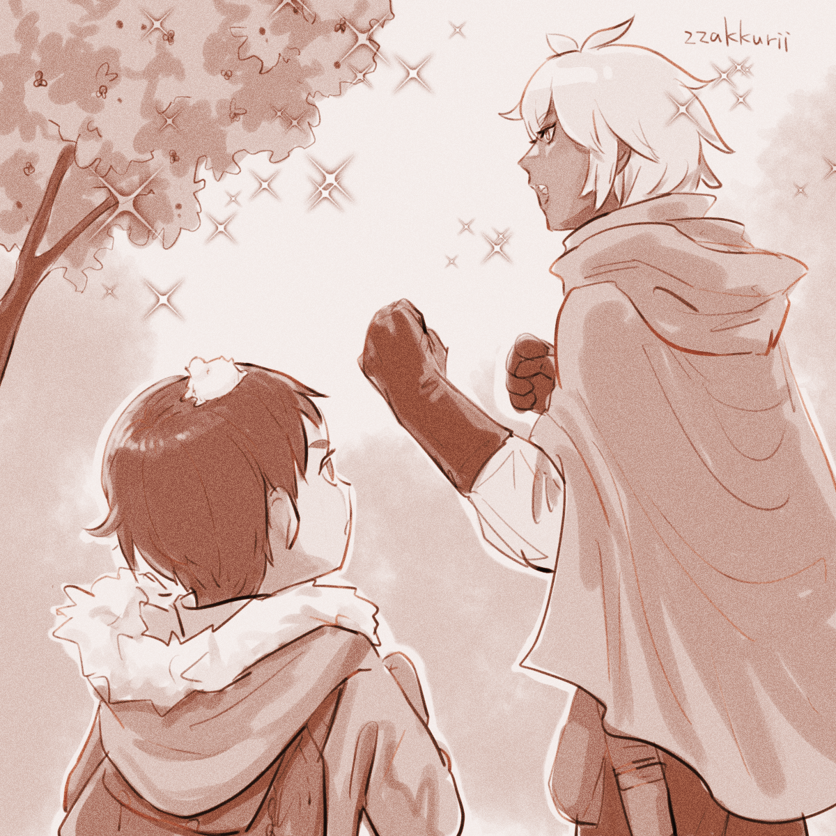 すごくいいものを見つけてわくわくしているアキと、それを見て「わくわくしてるなあ」と思ってるアウルです。