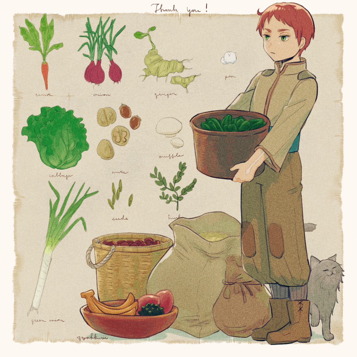 異世界の野菜の名前を考えるのは大変なので、ほとんどアウルが翻訳したという形で、こちらの世界の野菜の名前を流用しています。イラストの野菜は形が微妙に異なるものもあります。