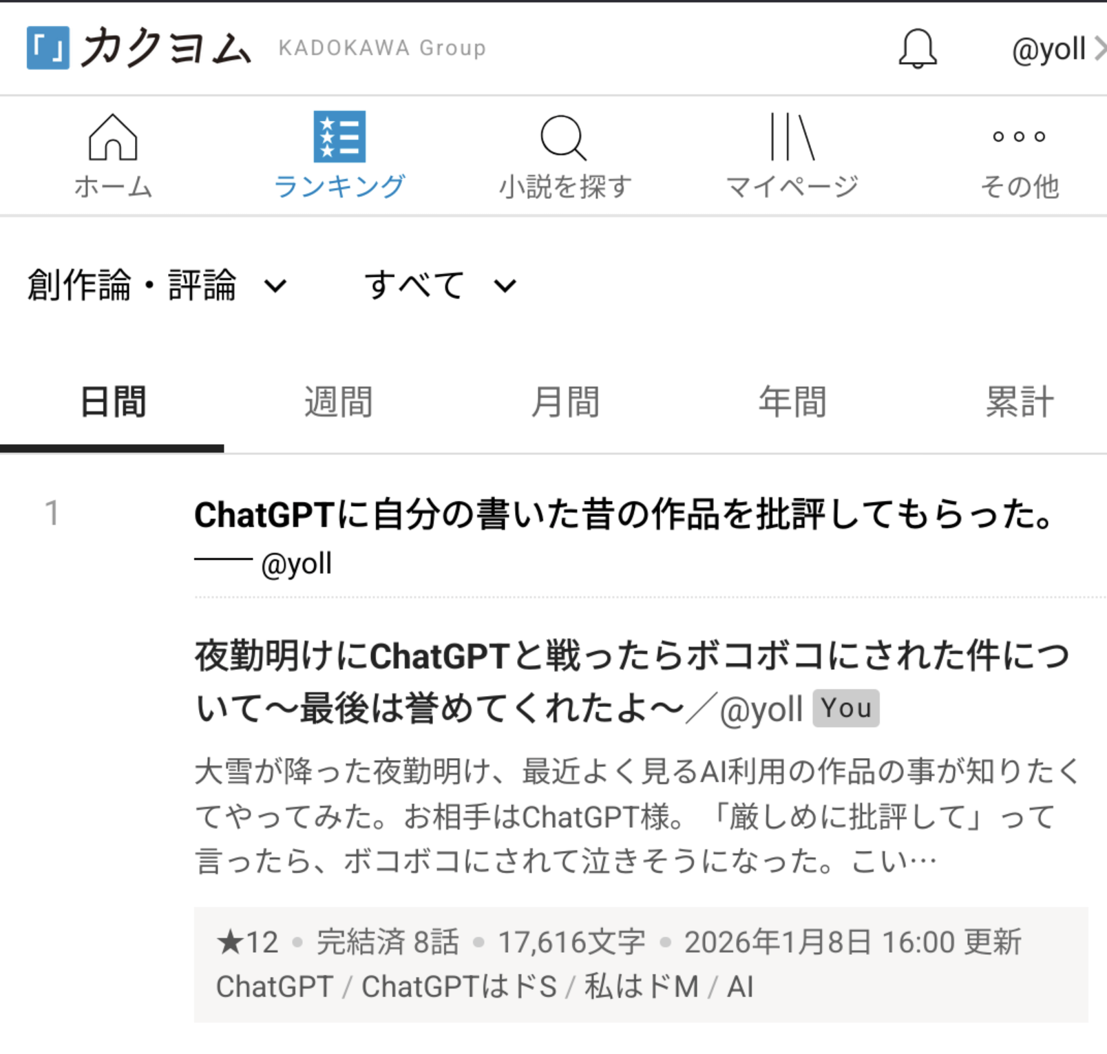 フォローしてる作者様の近況などに紛れて、昨日投稿した「夜勤明けにChatGPTと戦ったらボコボコにされた件について~最後は誉めてくれたよ~」が創作論・評論の週間ランキングで何と13位とのこと。