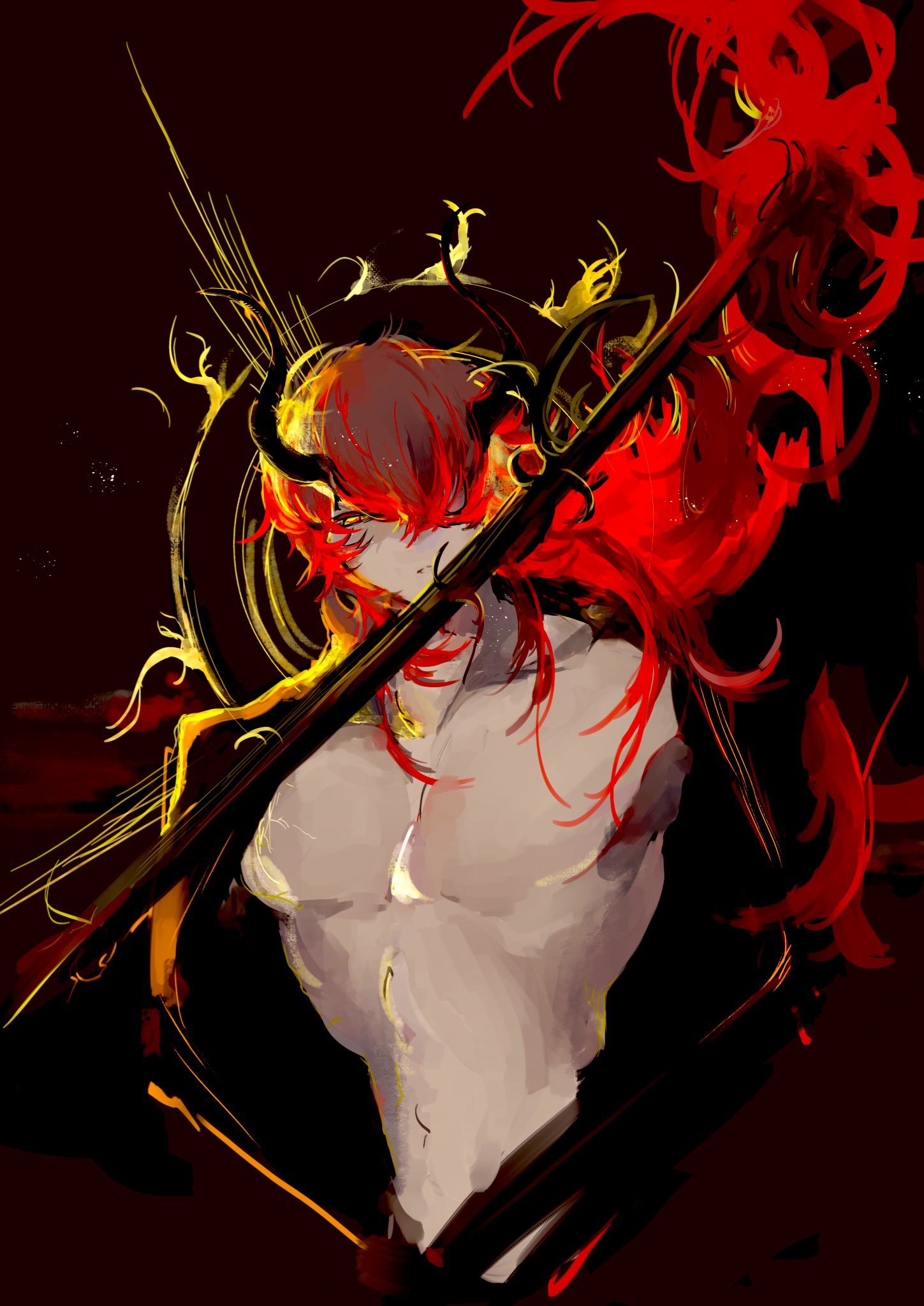 人間のような姿に近づいた魔族。人外らしい雰囲気までしっかり掴んでいただけ、背中の輪、大太刀、炎蒸の炎、燃える夜空などストーリー上の雰囲気まで満載です! イメージしやすくて、とても嬉しい…! ありがとうございました。