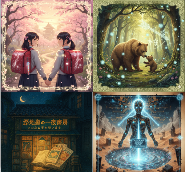 そして、四作品のイメージをAIで描いてみたところ、ところどころ文字化けしてしまいました。なので、小説の創作にはまだちょっと使えそうにありません。細かいところはご愛嬌ということで、どうぞ笑って流していただけたら嬉しいです(◍˃̵͈̑ᴗ˂̵͈̑)ァ,、。