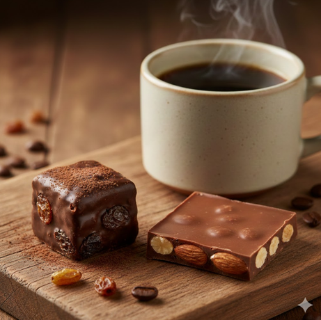 みずみずしいレーズンとラム酒が奏でる芳醇なハーモニーのひと粒、香ばしいアーモンドがサンドされた濃厚な一枚。