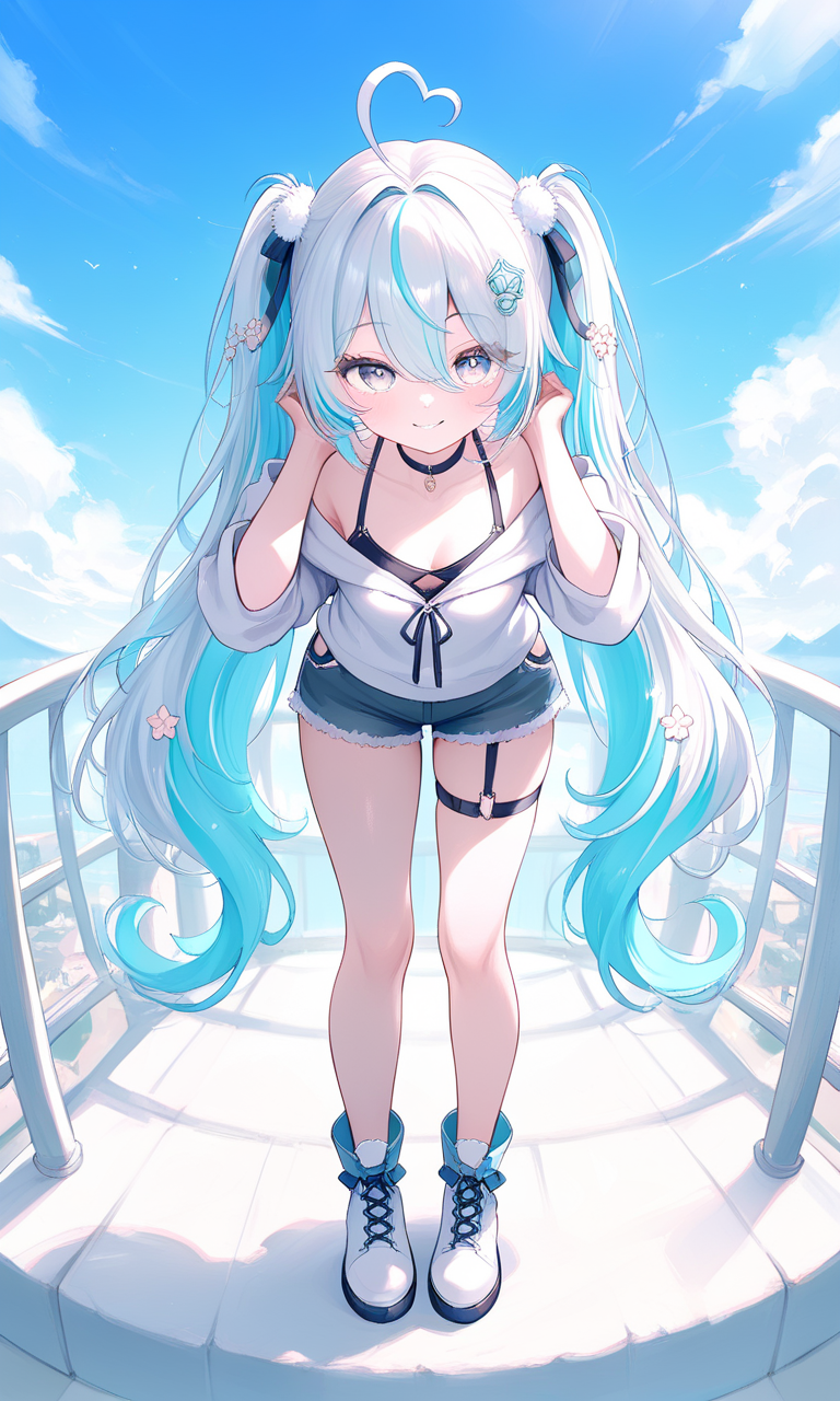 girl kawaii, extremely delicate and beautiful, detailed and beautiful, full body, Girls' Front, leaning forward, Perfect female body, Beautiful detailed girl, little girl, eyes visible through hair, twintails, pale blue hair, two-tone hair, super fucking beautiful, smirk, complex details beautiful and delicate eyes, human hands, small Breasts, perfect and delicate limbs, beauty detailed eye, highly detailed skin, beautiful hair ornaments, off shoulder top, shorts, modestly dressed, hoodie, boots, cropped torso, garter straps, outdoors, blue sky, extremely detailed, best quality,