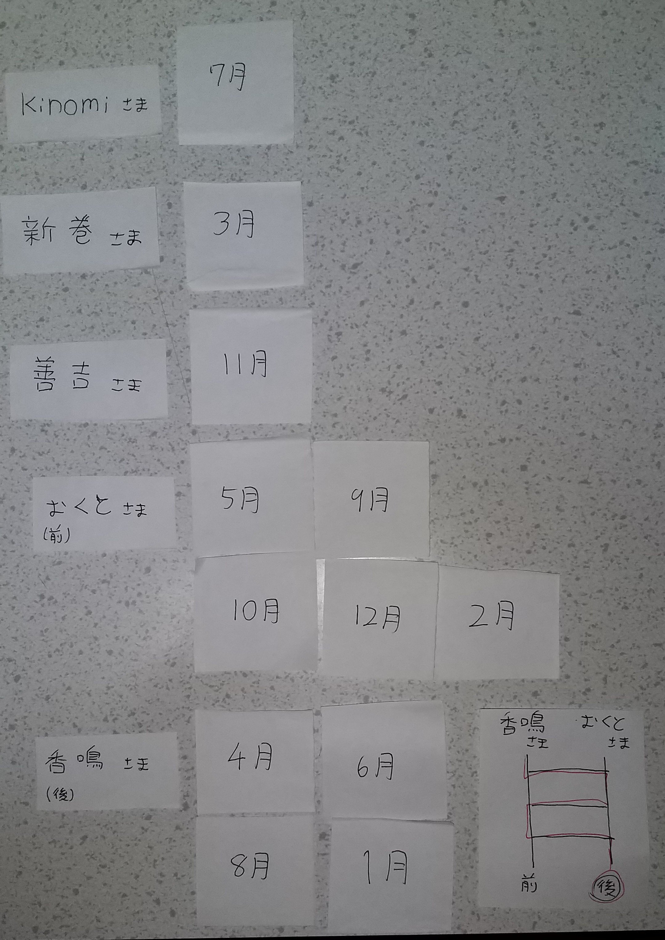 また、香鳴さまとおくとさまは、複数回主催可能ですが、どちらかが5回になってしまうので、アミダくじによってどちらから先にくじを引くのかを決めました。このアミダくじも、画像の端に載せています。