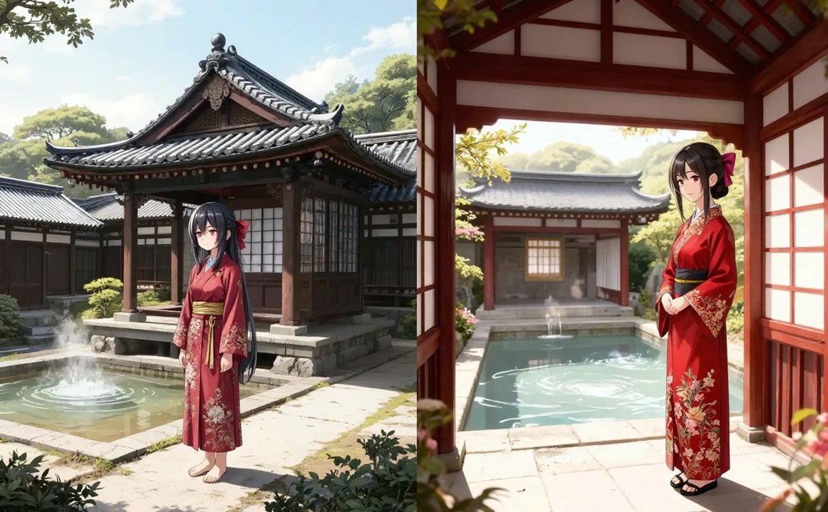 『制服星愛:赤い漢服を着て静かに露天風呂横の東屋に佇む制服星愛、背景はアニメーション風』