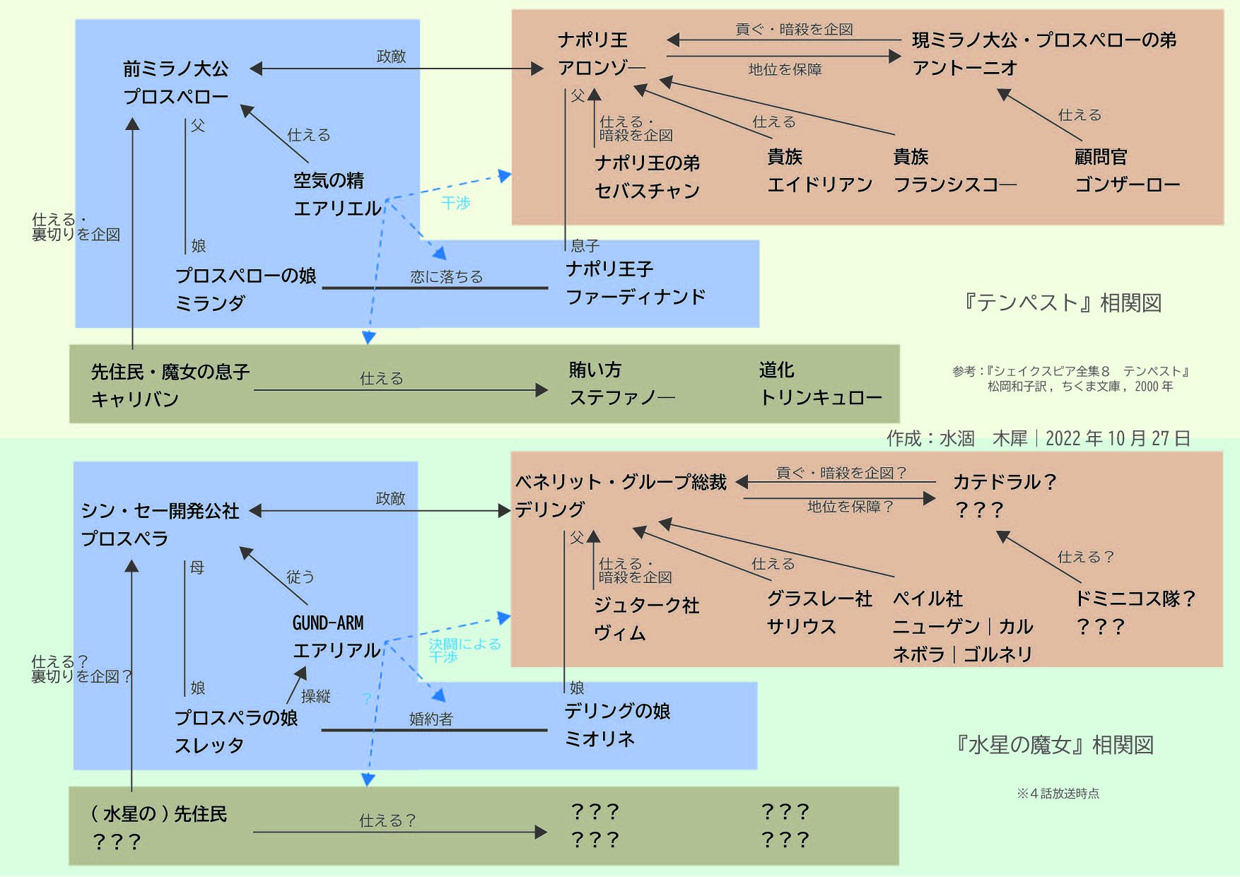 それに「水星の魔女」の人物を当てはめた相関図を作成したので、公開いたします。