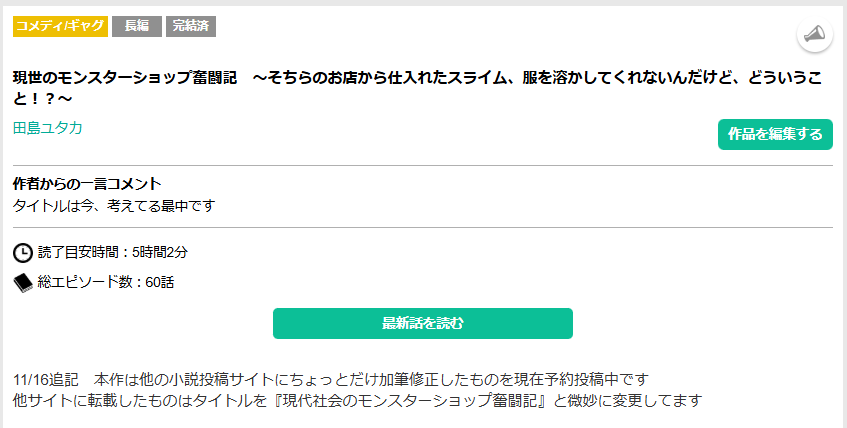 元々は3年前に小説投稿サイト、ノベルアッププラスにて『現世のモンスターショップ奮闘記 ~そちらのお店から仕入れたスライム、服を溶かしてくれないんだけど、どういうこと!?~』というタイトルで投稿してたものを、ちょっとだけ加筆修正したものとなります