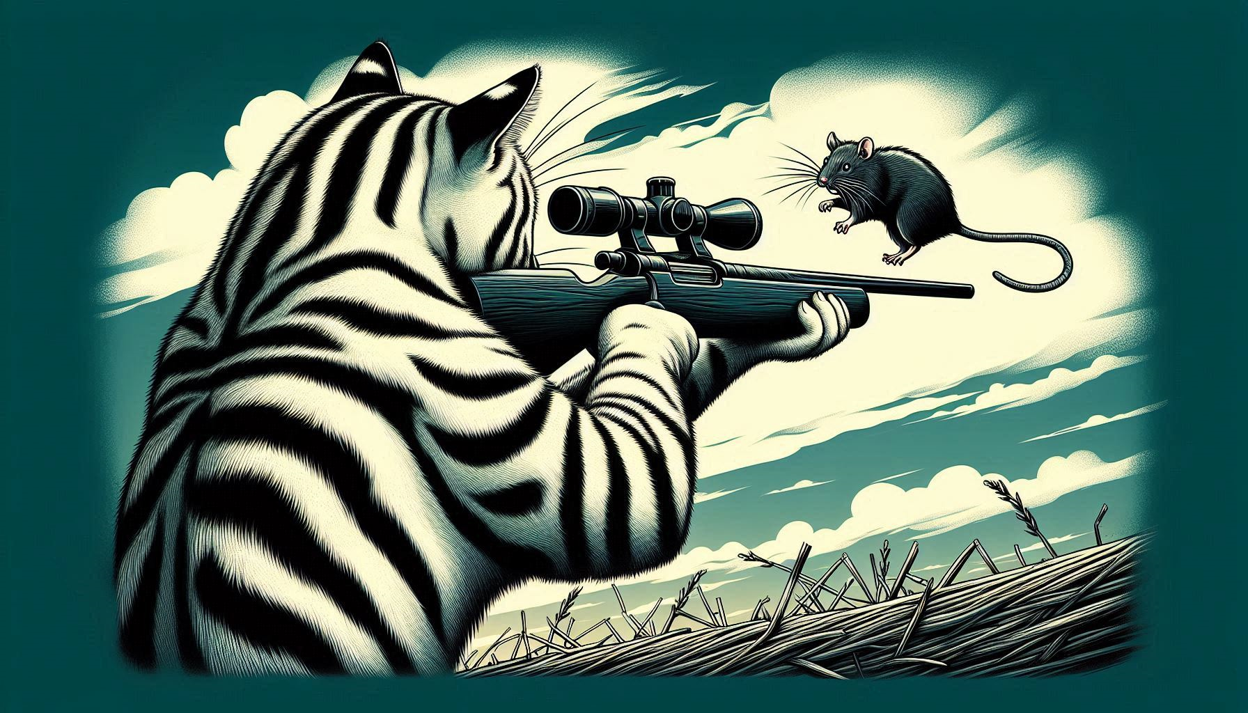 画像生成AIに書かせたイラスト 「ネズミを狙っているネコの後姿 ネコは白黒のトラネコ」