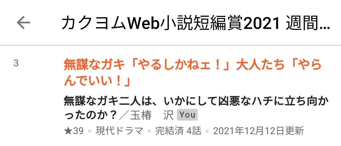 カクヨムweb小説短編賞2021に応募中の「無謀なガキ二人は、いかにして凶悪なハチに立ち向かったのか?」は、皆様に応援され、現代ドラマの週間ランキング3位と善戦しています。