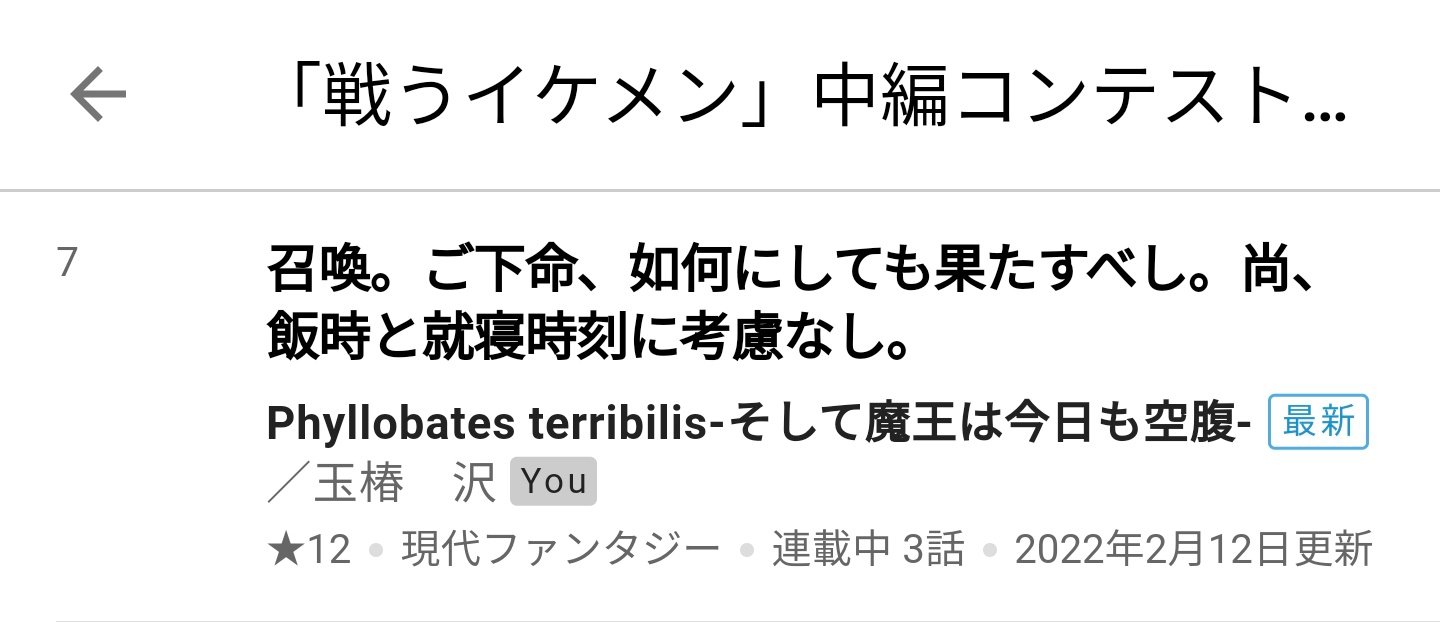 戦うイケメンコンテストに、新作「Phyllobates terribilis-そして魔王は今日も空腹-」を出しておりまして、この目処が立つまで…と思ってます。